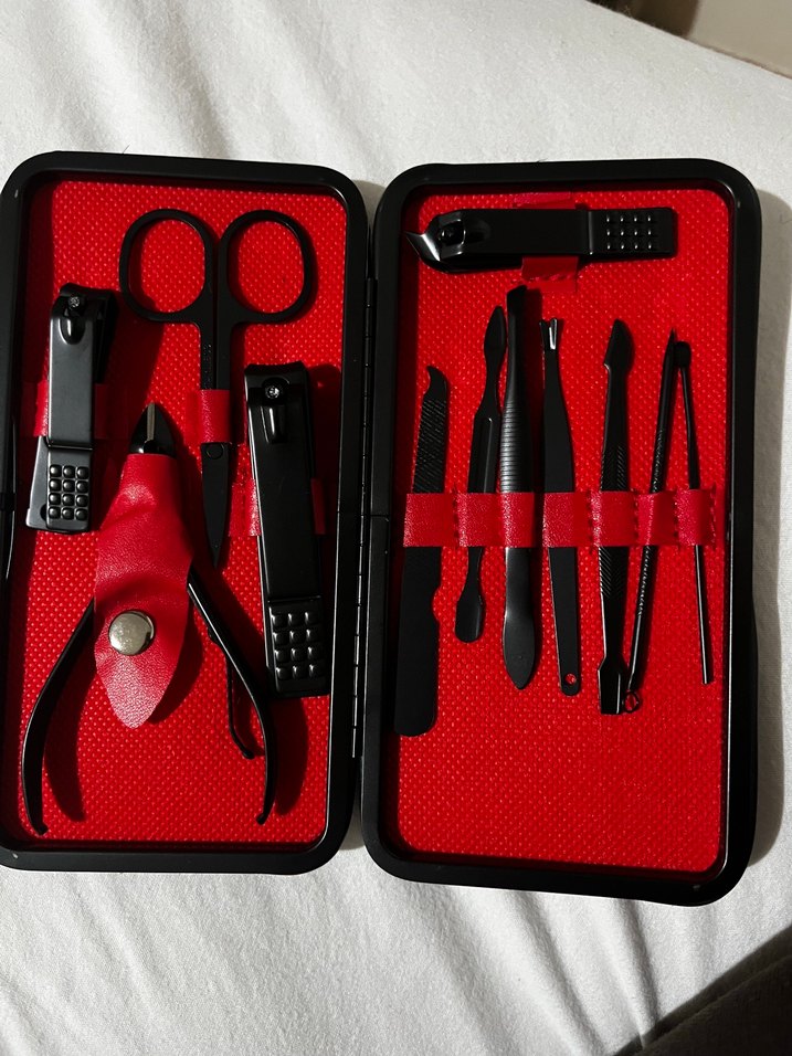 Nail cutter, scissors, pincet ve tırnak eti itici gibi çeşitli aletleri içeren kırmızı renkte manikür ve pedikür seti. ✂️