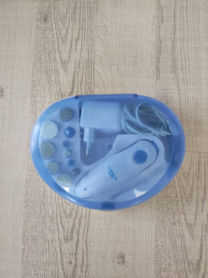 10 farklı uç ve şarj cihazı içeren, kompakt kutuda mavi manikür ve pedikür seti.