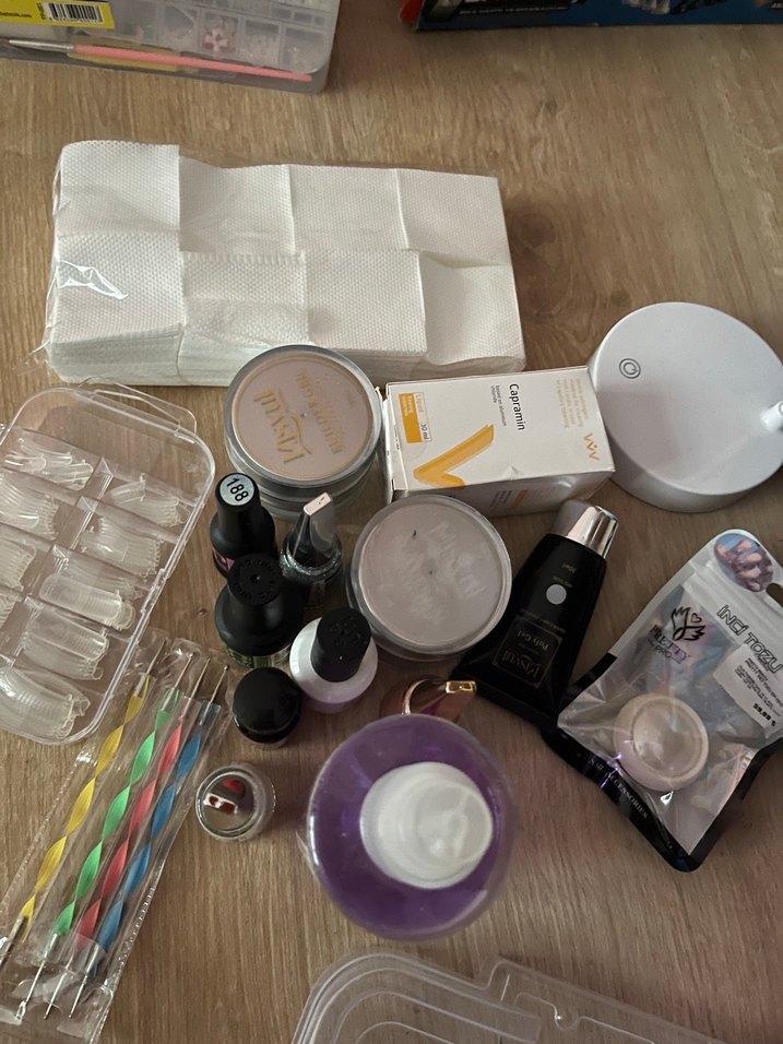 Beyaz renkte, oje, takma tırnaklar, tırnak eti aletleri, mendiller ve tırnak sertleştirici UV lamba içeren manikür ve pedikür seti.