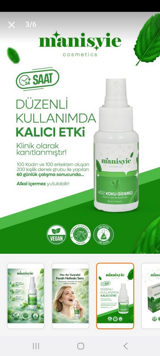 Manisiye ağız koku giderici sprey, düzenli kullanımda kalıcı etki sağlar. Klinik olarak kanıtlanmıştır, vegan ve alkol içermez, yutulabilir. 200 kişilik denek grubuyla 60 gün test edilmiştir.