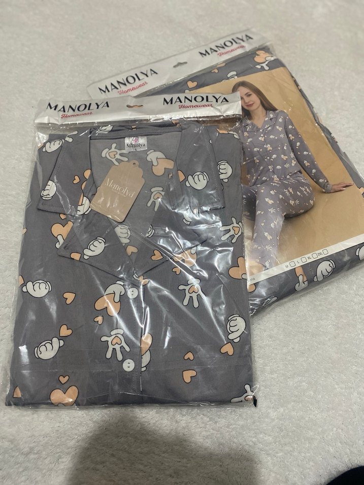 Manolya markalı, gri renkli, desenli, uzun kollu, midi boy, bol kesim kadın pijama takımı. Rahat ve konforlu bir tasarıma sahiptir.