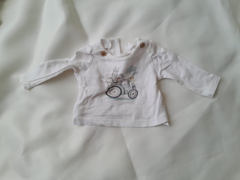 Pamuklu, uzun kollu, düğmeli ve baskılı motifli beyaz kız çocuk tişörtü. Salaş kesim ve yuvarlak yakaya sahip.