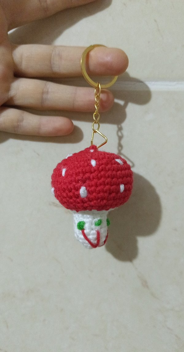 Kırmızı kapaklı, beyaz benekli el emeği mantar anahtarlık gold anahlik ile örülmüştür.alize katın Gold ip ile