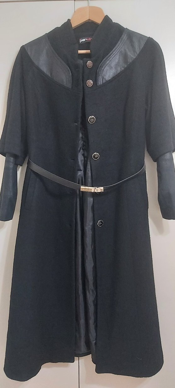 Siyah deri, kemerli ve uzun kesimli kadın kaban, klasik gotik tarzıyla ofis kullanımı için uygundur. Notch yakalı ve askılı kolludur.