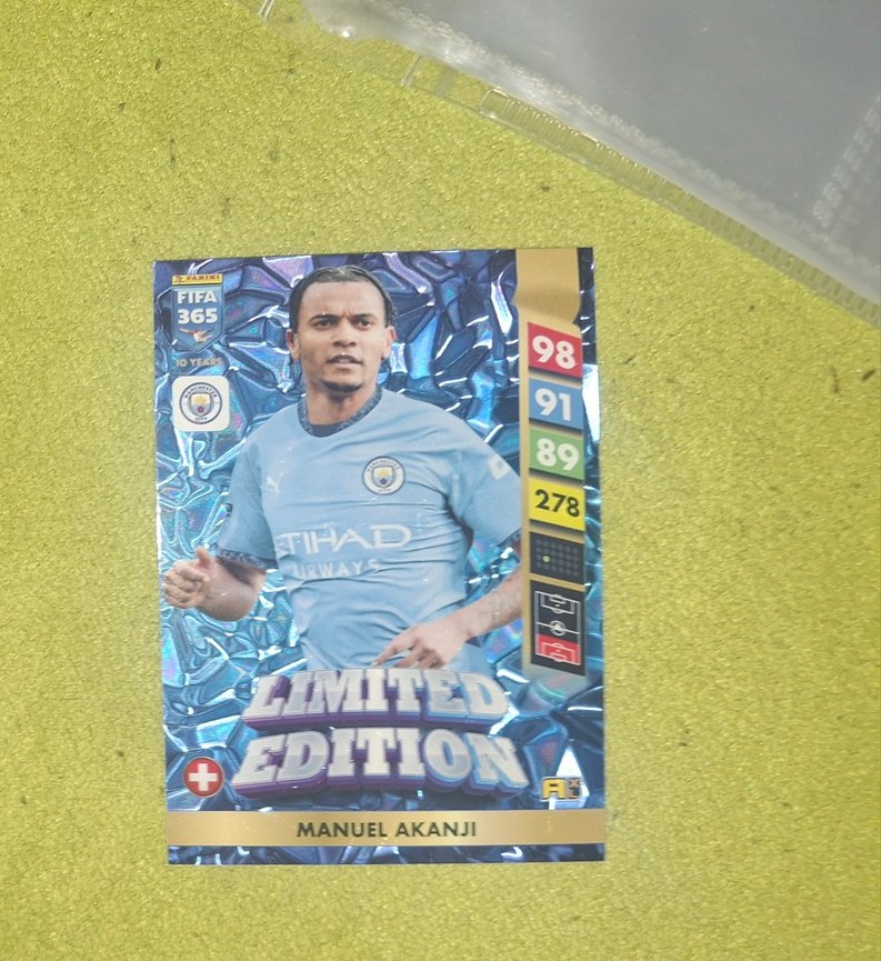 Manuel Akanji'nin sınırlı sayıda üretilen futbol kartı, canlı holografik detaylar ve altın renk vurgularıyla dikkat çekiyor. Oyuncu istatistikleri ve takım bilgilerini içerir. ⚽