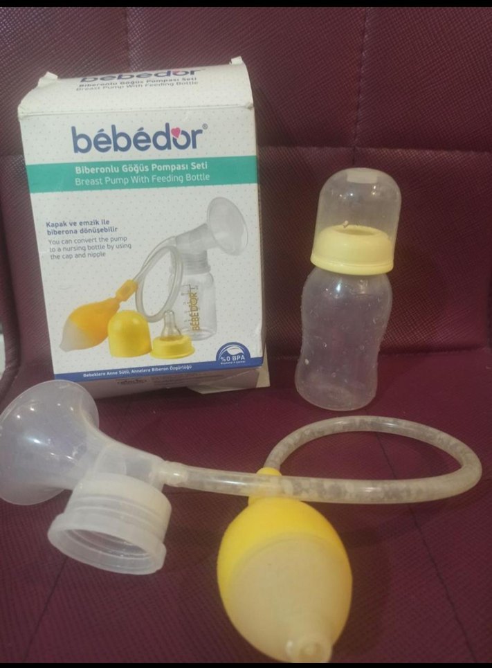 Bebedor marka sarı renkli göğüs pompası seti, elle kullanıma uygun yumuşak pompa ve sarı kapaklı beslenme biberonundan oluşur.