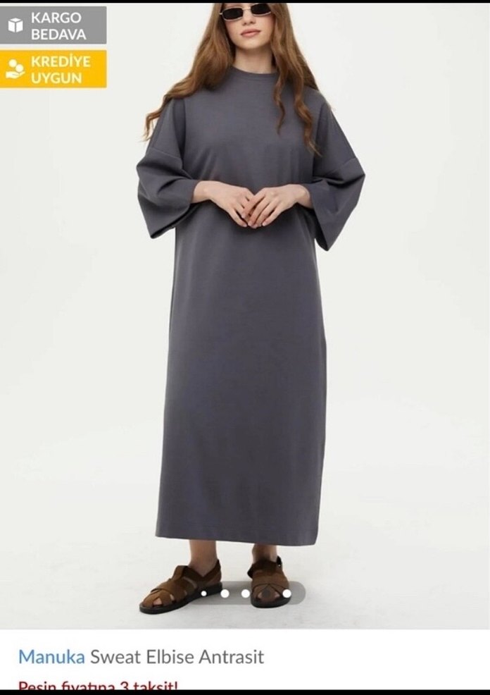 Manuka uzun sweat elbise, gri renkte, bol kesim, yuvarlak yaka ve uzun kolludur. Yumuşak sentetik kumaştan yapılmış, günlük kullanım için zahmetsiz şıklık sunar. ♀️