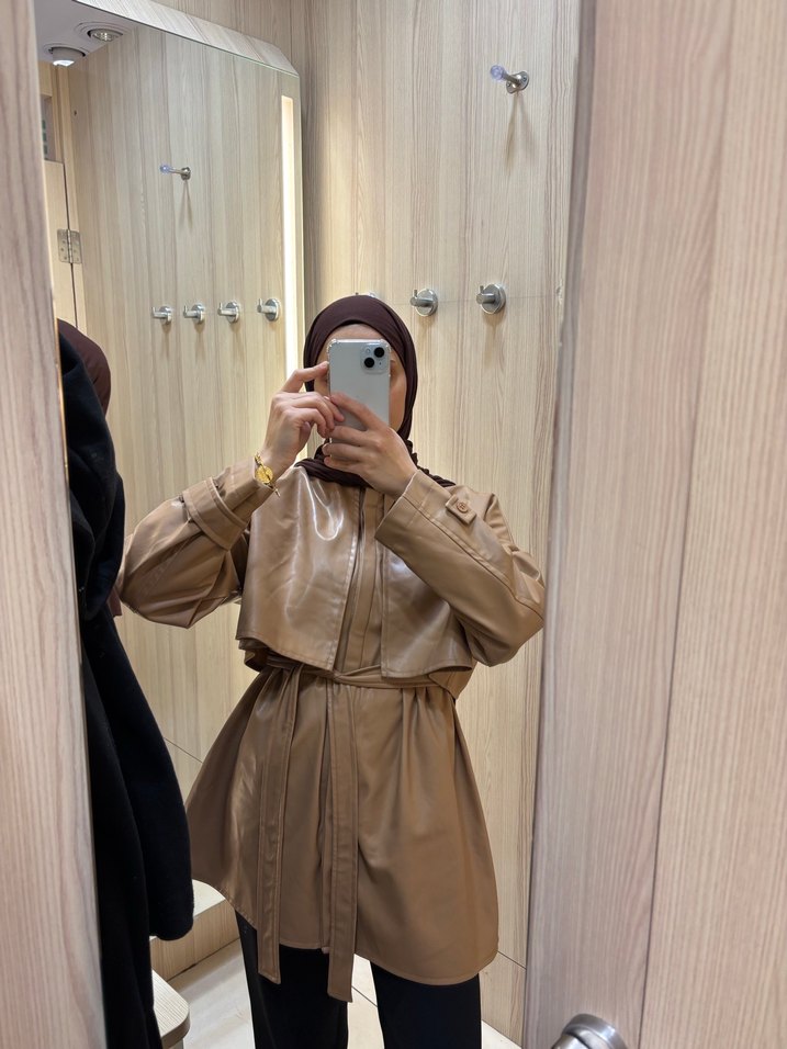 Bej deri midi trençkot, bol kesim, uzun kollu ve yüksek yakalı. Günlük sokak stili için rahat ve şık bir parça. M/L uyumludur S/M almak için satıyorum. Yakasını terzide yaptırdım