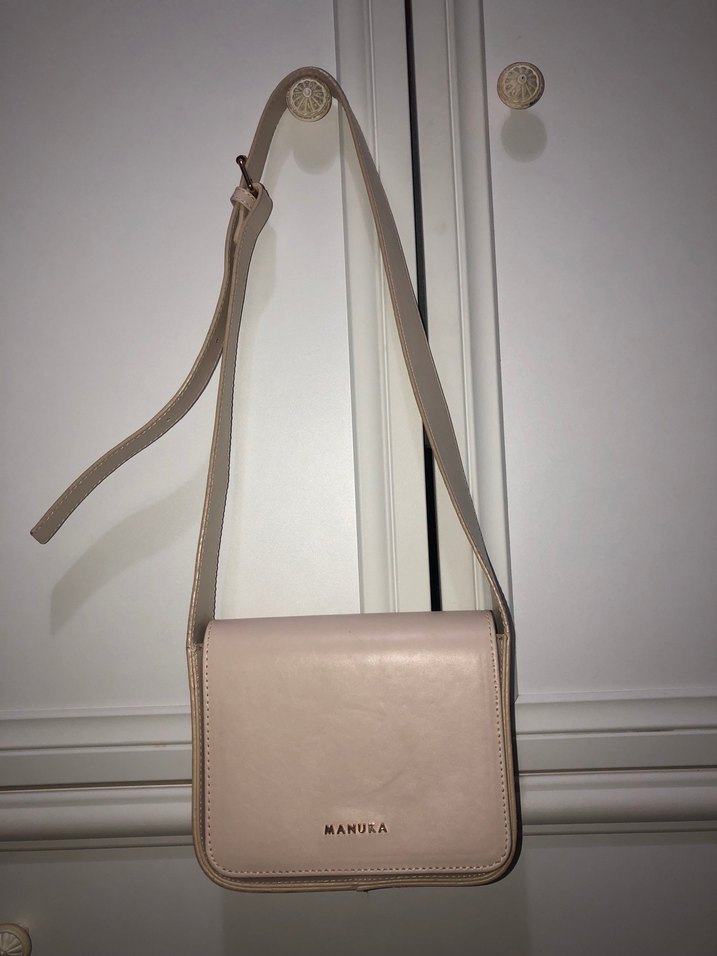 Bej renkte, deri malzemeden yapılmış, tokalı askıya sahip kadın çantası. Önünde MANUKA markası bulunur. Günlük kullanıma uygundur. Çanta üstüne bazı aşınmalar mevcut.