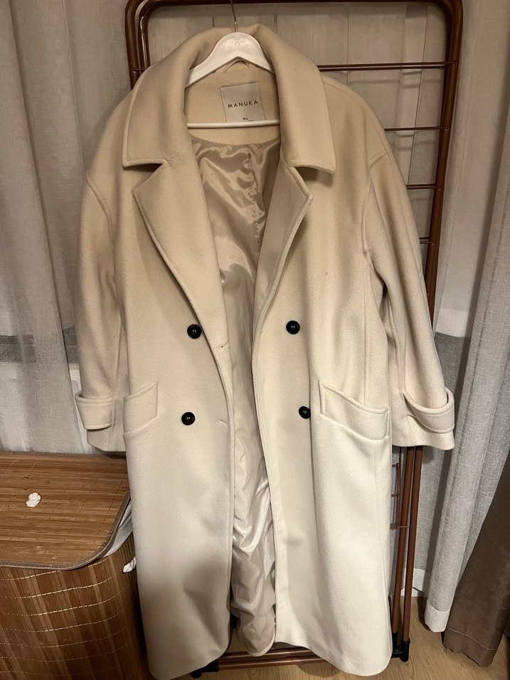 Markası Manukadır. Çift düğmeli, bej uzun kaban. Yaka detaylı ve iki ön cepli. İç kısmı düzgün astarlı. Serin havalar için uygun.