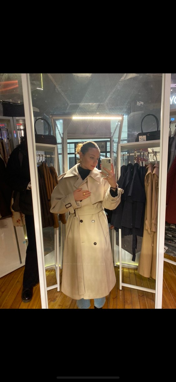 Bej midi trençkot, yaka detaylı ve uzun kolludur. İpeksi kumaştan üretilmiş, rahat kesimiyle günlük kullanıma uygundur. ✨