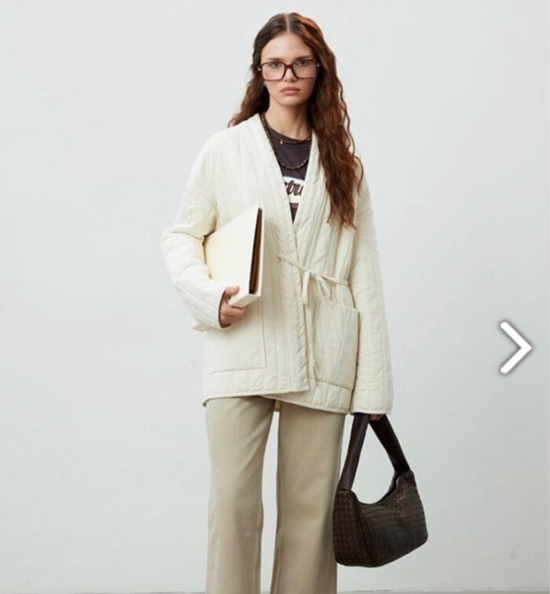 Beyaz , uzun kollu ve yakası notched lapel olan, bol kesim ve midi boyda rahat bir kadın ceketi. Drapeli tarzıyla bohem bir görünüm sunar. Manukanın ürünüdür.