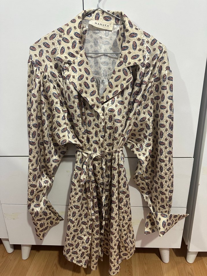 Bohem tarzda, uzun kollu ve yılan desenli, gri-beyaz renkli, bol kesim kadın elbisesi. Uzun boyuyla şıklık katıyor.