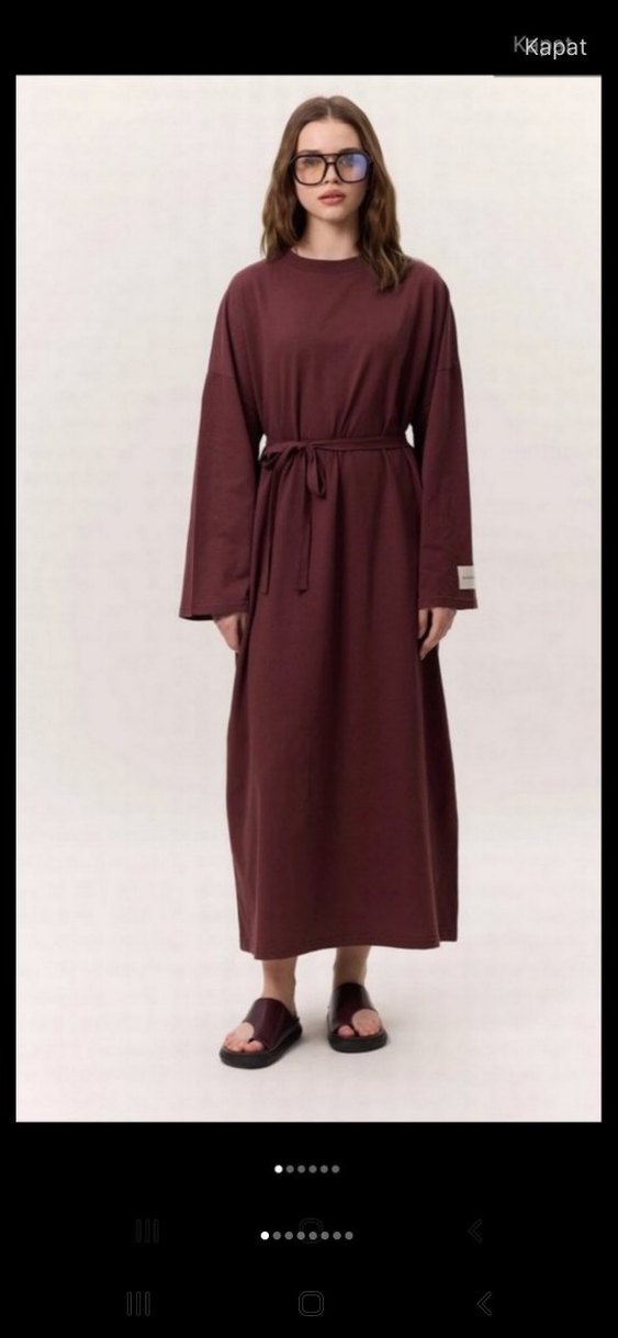 Bordo renkte, bol kesim, yüksek yakalı ve uzun kollu kuşaklı kadın elbisesi. Düz ve sentetik kumaştan yapılmıştır, günlük sade şıklık için uygundur.manukadir lcwakiki degil arkasında hafif defo var