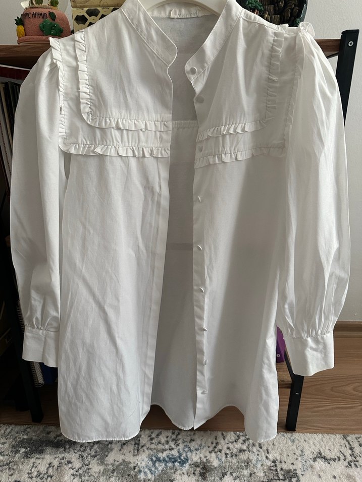 Düğmeli, uzun kollu, keten kumaştan beyaz bohem tarzı gömlek. Hafif ve rahat, günlük kullanım için uygundur.