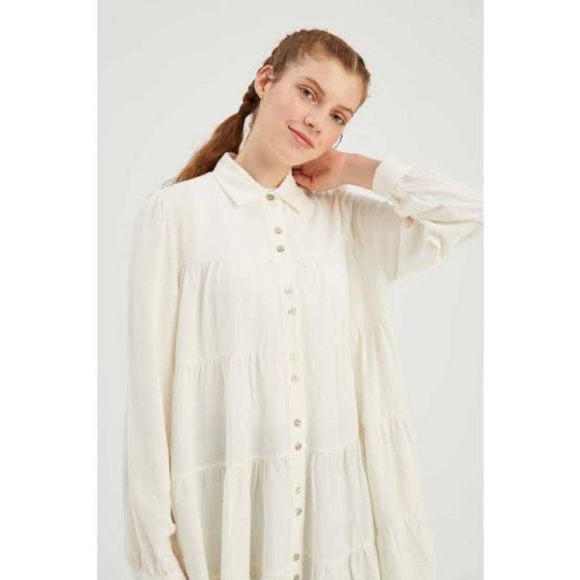 Düğmeli, uzun kollu, yakalı beyaz ve yeşil keten gömlek. Midi boyda, bol kesim, sade ve bohem tarzda bir parça.