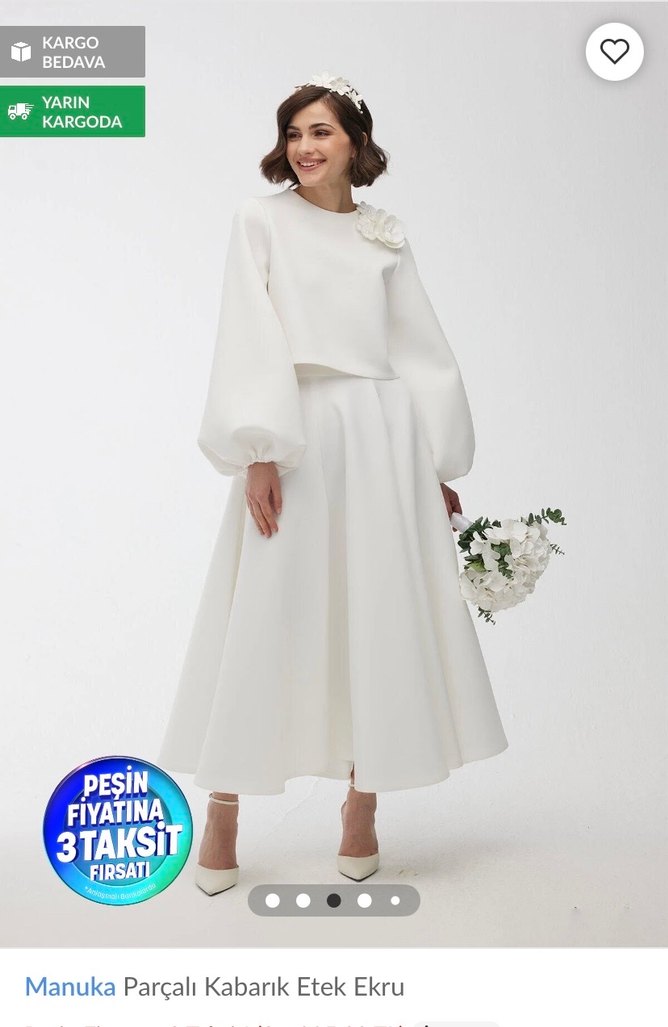 Manuka parçalı etek ve kabarık üst takım. Sadece 1 saat nikahta giyildi. Defosuz. S-M beden.