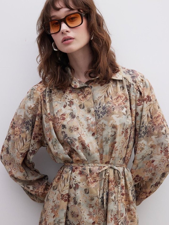 M beden ancak s-l arası uygun, uzun kollu, yakalı ve düğmeli gömlek. Pastel çiçekli batik desenli, yumuşak pamuk kumaştan. Sayılı kullanıldı.