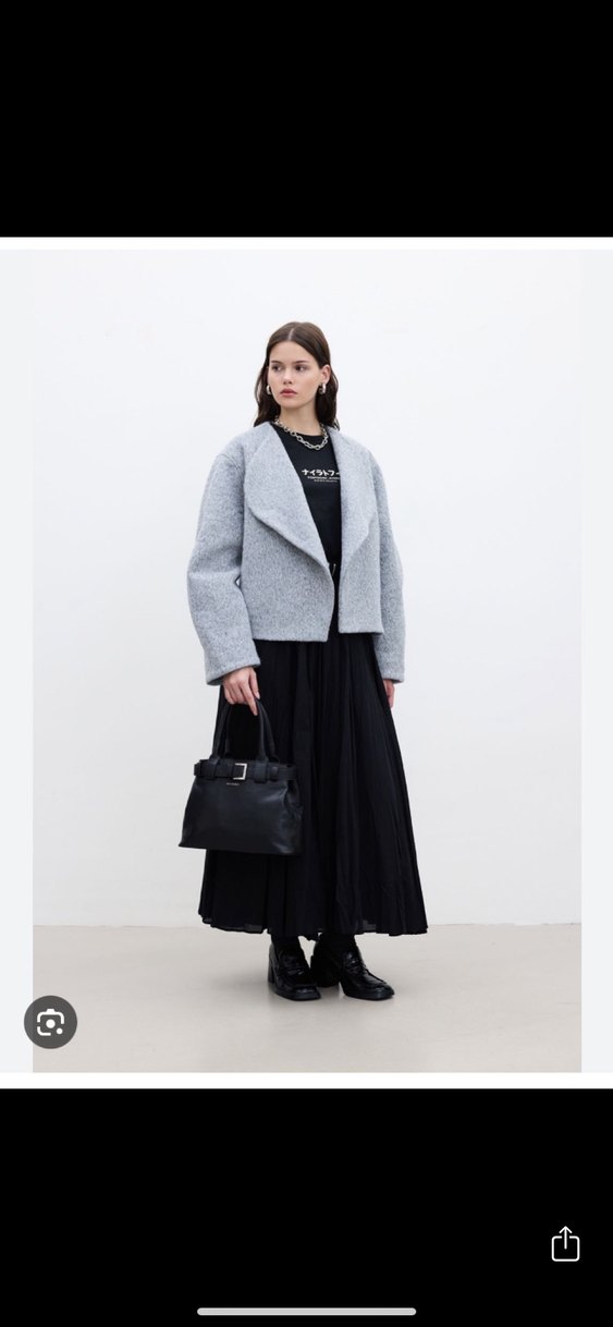 Gri midi uzunlukta kadın kaban, uzun kollu ve kesik yaka detaylıdır. Yumuşak ve sıcak kumaştan üretilmiş, desensiz ve minimalist bir görünüme sahiptir.