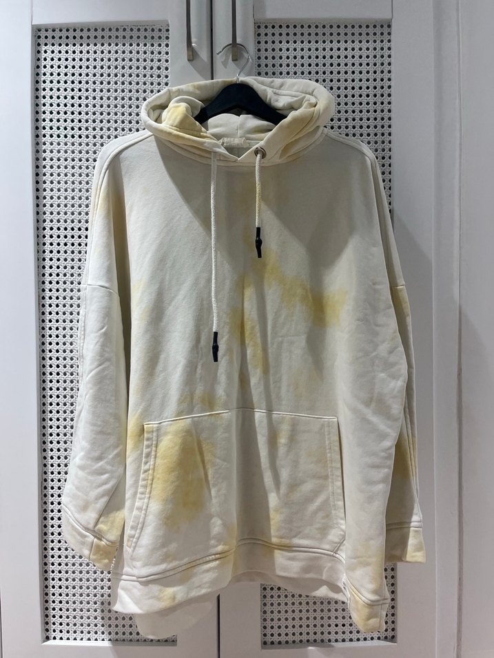 Hafif tie-dye desenli, uzun kollu, bol kesim beyaz kapüşonlu sweatshirt, rahat sokak stili için yumuşak kumaşla. Standart beden