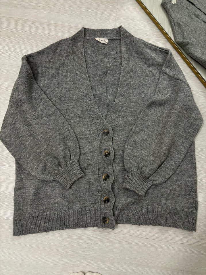 Gri renkli, düğmeli ve V yakalı kadın hırka. Uzun kollu, bol kesim ve midi boyda, rahat ve desen içermeyen tasarıma sahiptir.