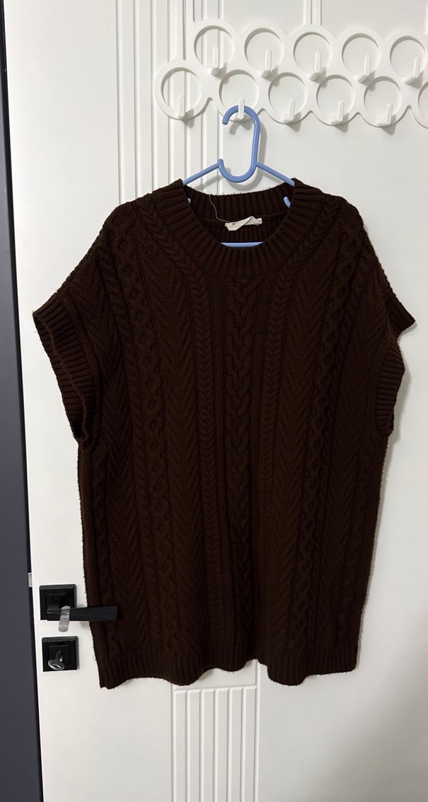 manuka Kahverengi örgü kadın süveter, kısa kollu ve yuvarlak yaka detaylarına sahiptir. Rahat kesimi ve sade tasarımıyla günlük kullanıma uygundur.