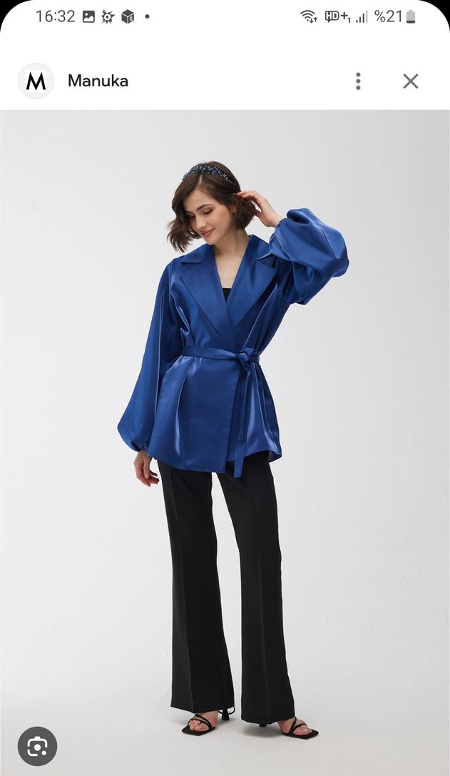 manuka kimono 1 kez kullanıldı Uzun boylu kadın mavi saten görünümlü parlak kumaş, yakası çentikli ve drapeli tasarıma sahiptir. Ofis için modern klasik tarzda, normal kesim ve uzun kolludur.