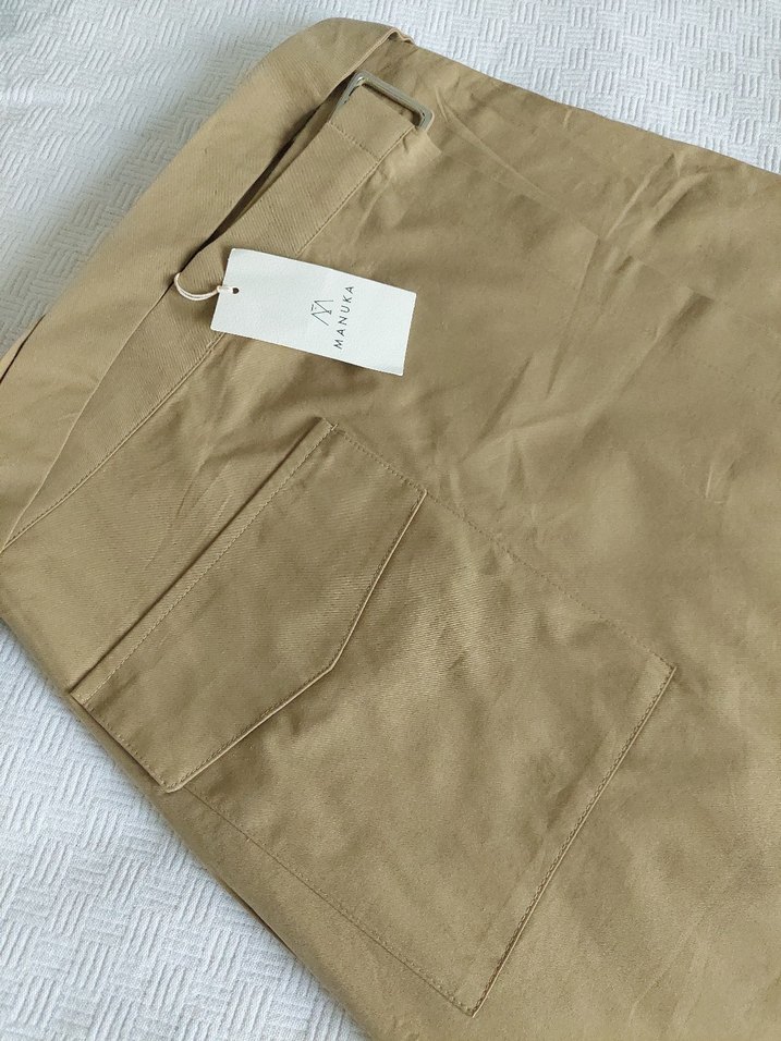 Manuka M Beden etek keten poplin gibi bir kumaş %100 pamuk Haki rengi sıcak bir rengi var bağlamalı önde kapak var, son fotoda çektim