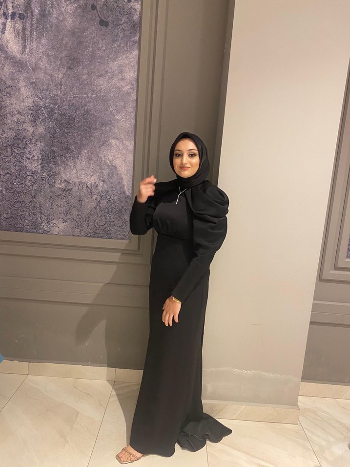 Uzun siyah elbise, yüksek yakalı ve uzun kollu olup drapeli tasarımı ve rahat kesimiyle minimal gotik tarzda günlük kullanıma uygundur.