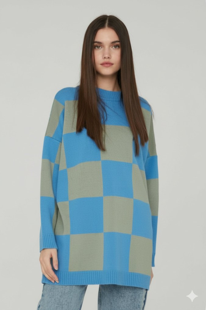 MANUKA Mavi Kareli Oversize Kadın Triko Kazak