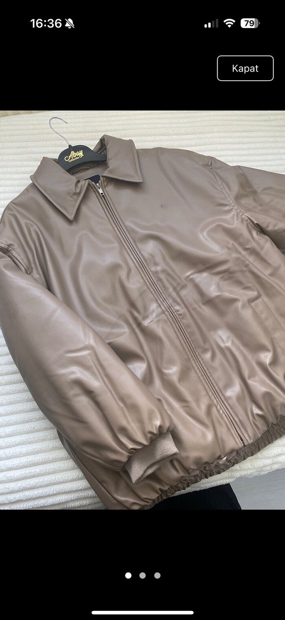 Bej renkli deri ceket, çıtçıtlı yaka ve fermuarlı ön kısmıyla dikkat çeker. Uzun kollu, normal kesim ve midi boydadır.