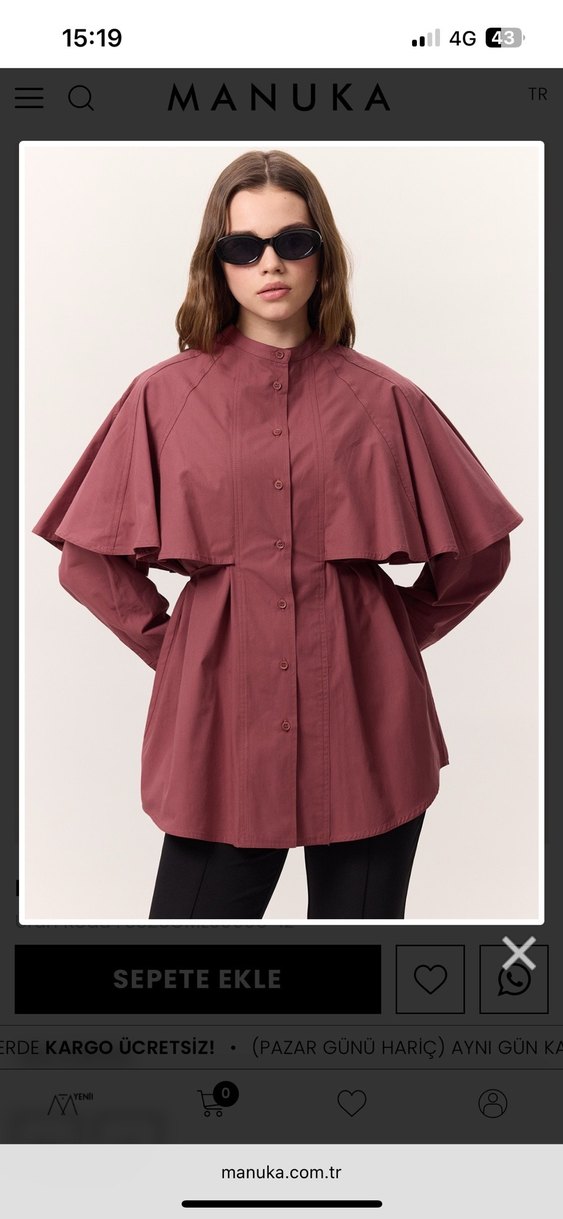 Bordo uzun kollu kadın gömlek, yüksek yakalı ve düğmeli önde. Sentetik kumaştan, omuzlarda pelerin detaylı, gül kurusu S/M beden