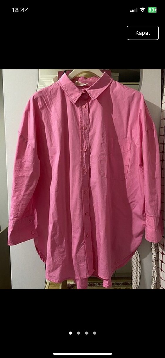 Düğmeli, uzun kollu, yakalı pembe keten gömlek. Rahat ve bol kesimiyle günlük kullanıma uygundur.