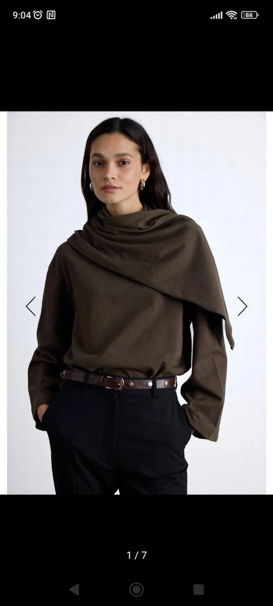 , yüksek yakalı ve uzun kollu, salaş kesim bej bluz. Drapeli tasarımıyla gündelik kullanıma uygundur.