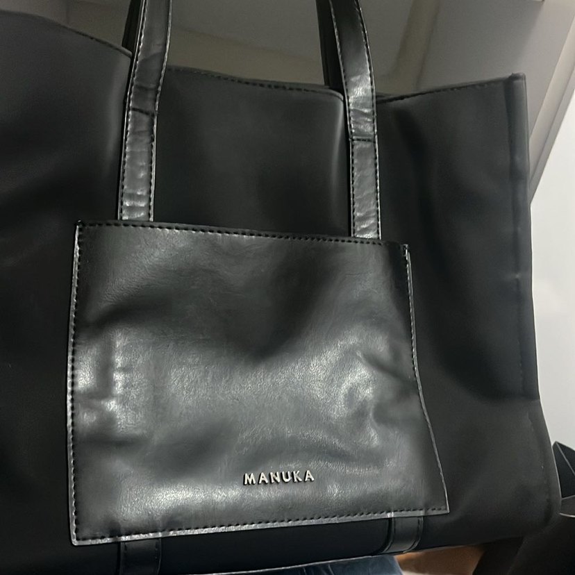 Manuka markalı siyah deri kadın çanta, minimal normcore tarzda ve tokalı tasarıma sahip, günlük kullanım için uygundur.