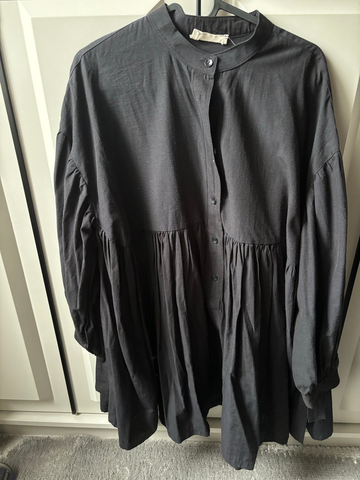 Siyah keten tunik, yüksek yakalı ve pliseli detaylara sahip, bol kesim ve midi boyda, gotik ve avangart tarzda. Günlük kullanım için uygundur.
