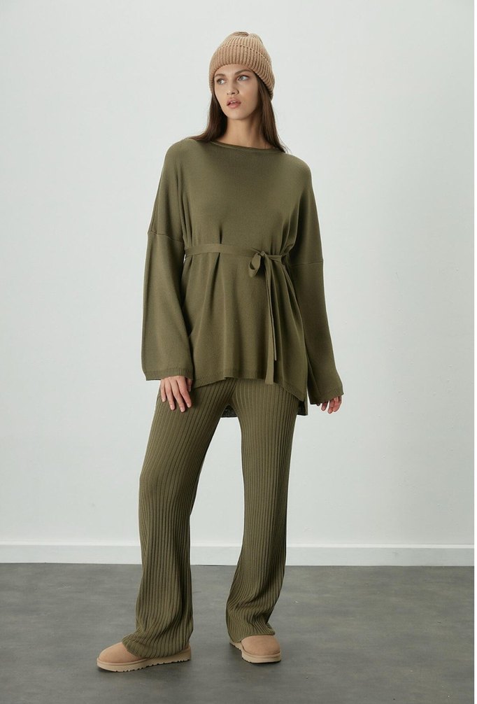 Kadınlar için salaş kesim, uzun boy ve yuvarlak yakalı triko takımdır. Yumuşak triko kumaştan yapılmış, haki renkte, günlük kullanıma uygun rahat ve şık bir görünüme sahiptir. Uzun kollu ve desensiz tasarımıyla konforlu ve trend bir stil sunar.