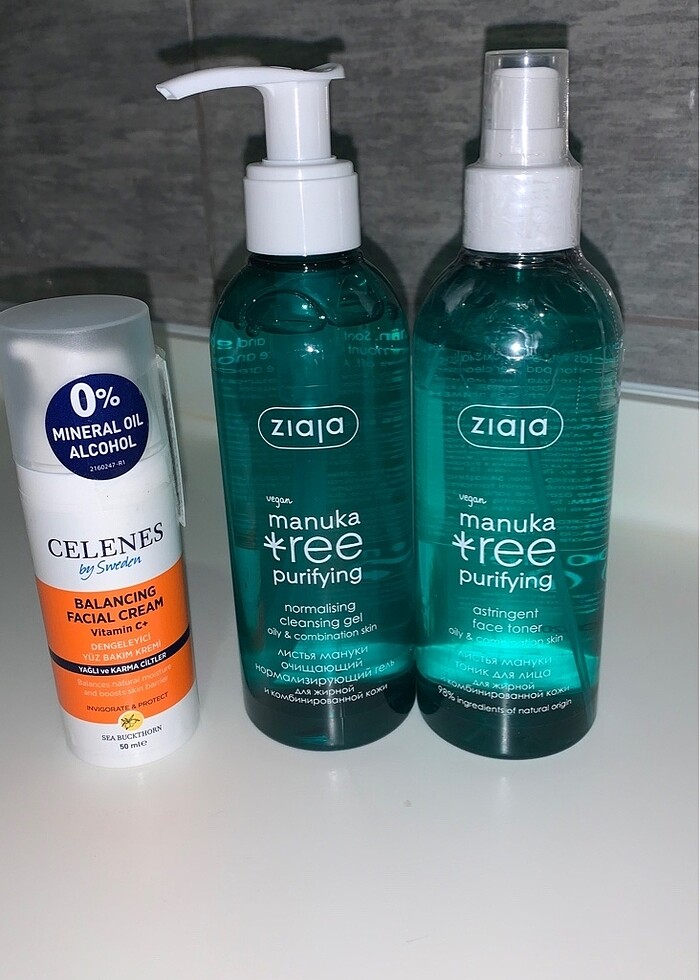 1- Ziaja manuka gözenek sıkılaştırıcı arındırıcı tonik- normal, yağlı ve karma ciltler için 2- Ziaja akneli cilt temizleme jeli 3- Celenes sea buckthorn dengeleyici yüz kremi yağlı ve karma ciltler için