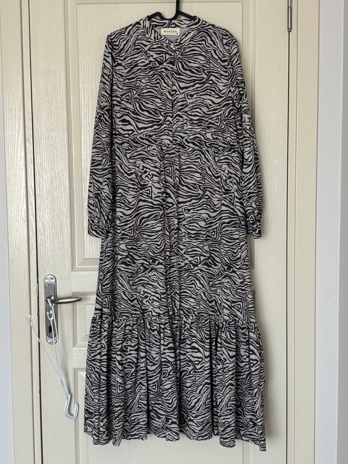 Manuka marka uzun kollu, bol kesim ve yüksek yakalı bu elbise, zebra desenlidir. Yumuşak sentetik kumaştan üretilmiş olup, pile detaylarıyla bohem tarz sunar.