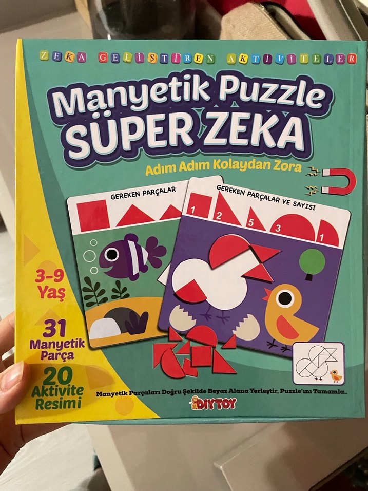 3-9 yaş arası çocuklar için 31 manyetik parçadan oluşan, 20 aktivite resmi içeren renkli zeka geliştiren puzzle seti. Adım adım kolaydan zora görevler sunar.