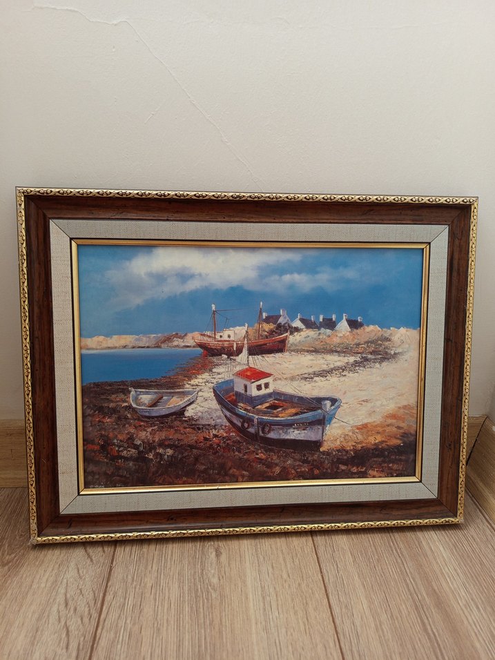 Çerçeveli tablo, mavi gökyüzü altında kıyıda teknelerle deniz manzarasını gösterir. Koyu mavi tonlarda sakin bir deniz atmosferi sunar.