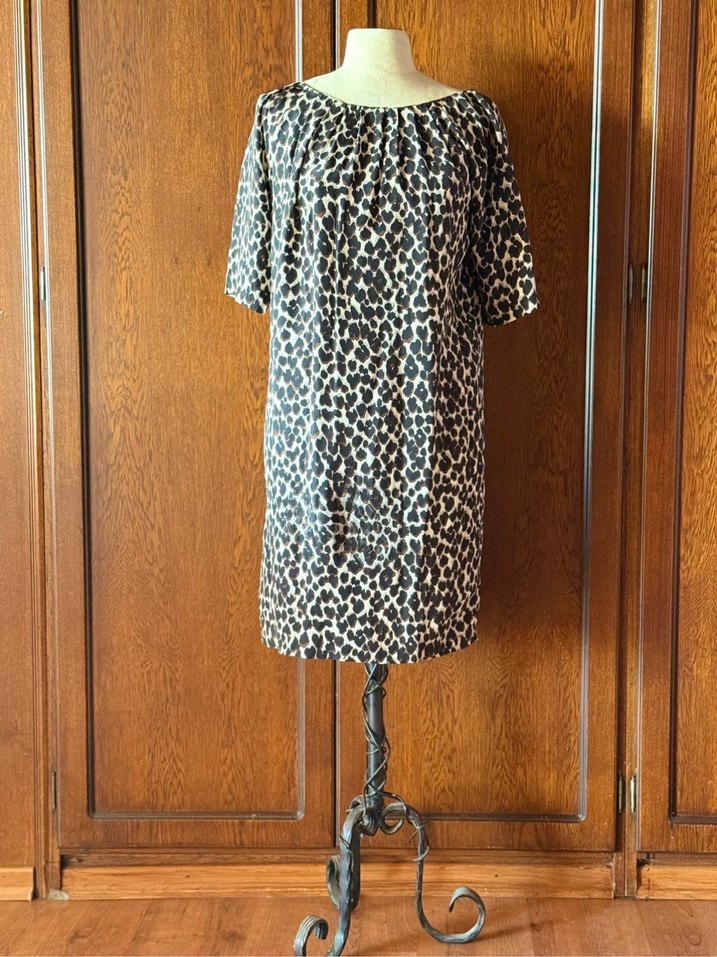 Siyah, gri, beyaz ve kahverengi leopar desenli, kısa kollu, şık elbise.