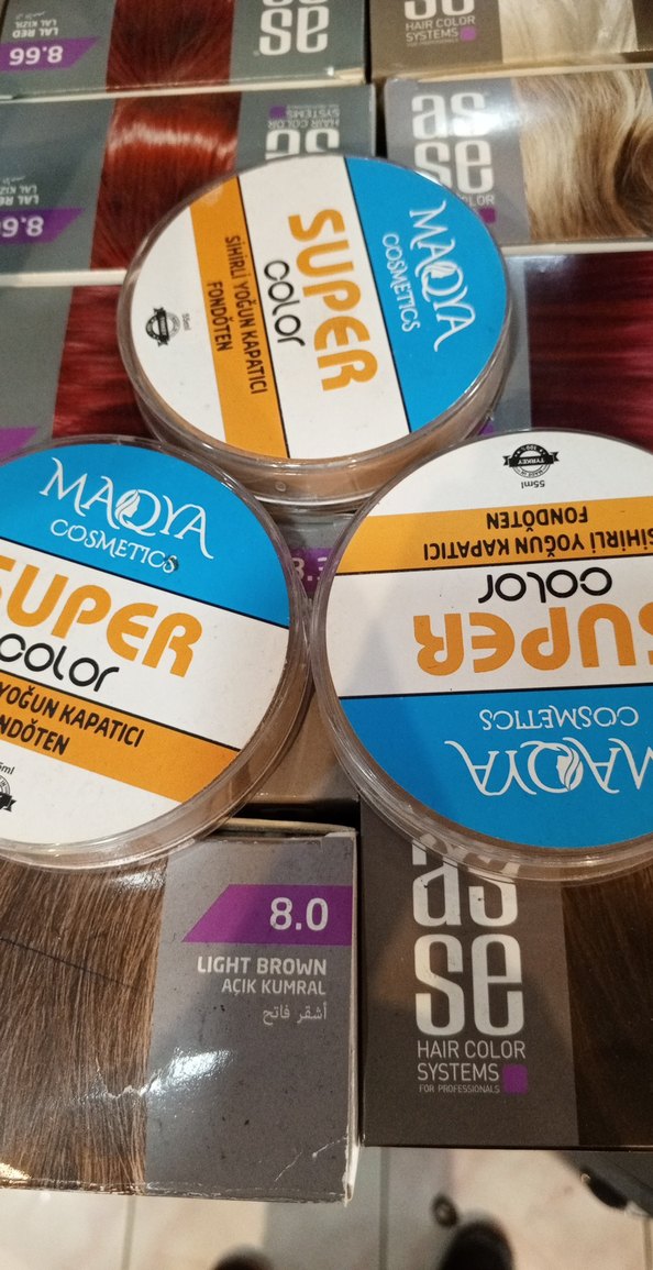 MAQYA Super Color saç boyası, açık kumral (8.0) yoğun kapatıcılı ve kremsi yapısıyla eşit uygulama sağlar.