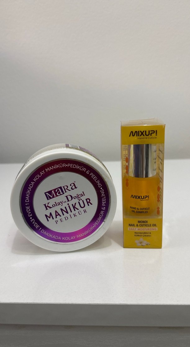 MaRa Manikür Peeling kolay manikür ve pedikür sağlar. Mixup Tırnak ve Tırnak Eti Yağı, Monoi yağı ile tırnakları besler.