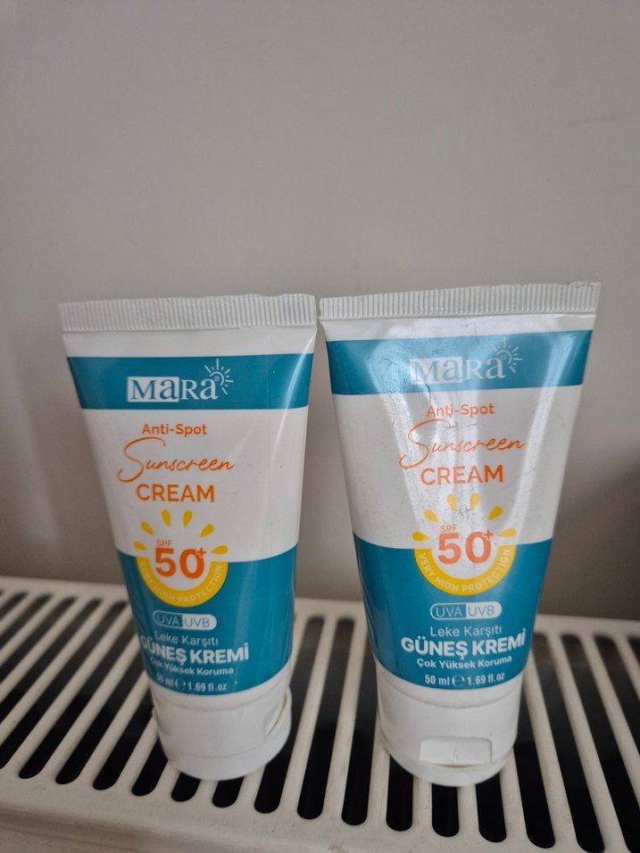 MaRa Anti-Spot Güneş Kremi, UVA ve UVB ışınlarına karşı SPF 50 koruma sağlar ve leke oluşumunu engellemeye yardımcı olur. 50 ml tüpte etkili güneş koruması sunar. biri kullanıldı biri kullanılmadı.