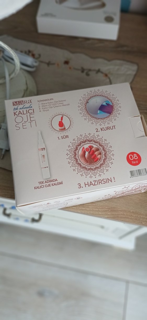 MaRa tek adımda kalıcı oje seti, oje kalemi, UV LED lamba ve tırnak bakım araçları içerir, kolay uygulama ve hızlı kuruma sağlar.