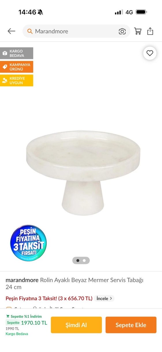 marandmore Rolin ayaklı servis tabağı, beyaz mermer görünümlü, 24 cm çapında, düz yüzeyli ve çağdaş tarzda bir üründür. ️ayagı kırıldı yapıştırıldı öne dogru hafıf eğimi vardır