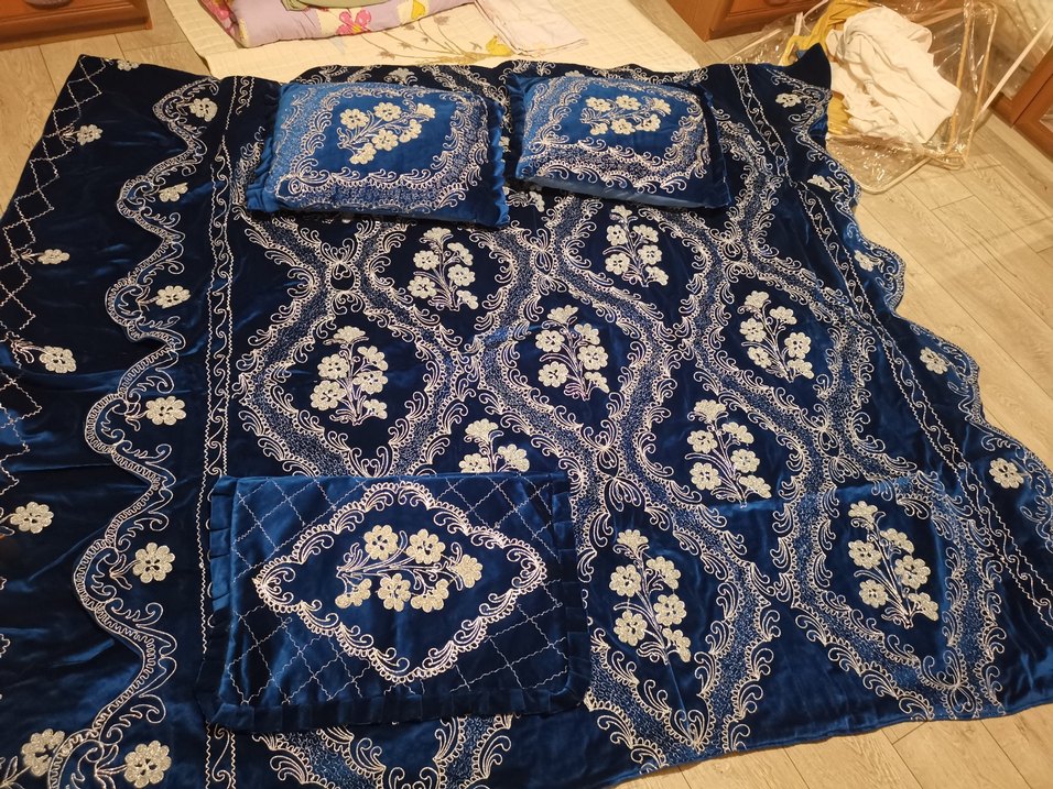 Maraş İşi ağır sırma ipek kadife yatak örtüsü. Nostalji üründür. Çift kişilik yatak uygundur. İki yastık ve Yatak üstü vardır. Pazarlık olur.