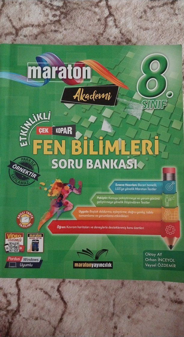 Maraton Akademi 8. sınıf fen bilimleri soru bankası; çek kopar, boşluk doldurma ve beceri temelli testler içerir. Windows uyumlu video çözümler mevcuttur. aralarda bazı testler yapılmış