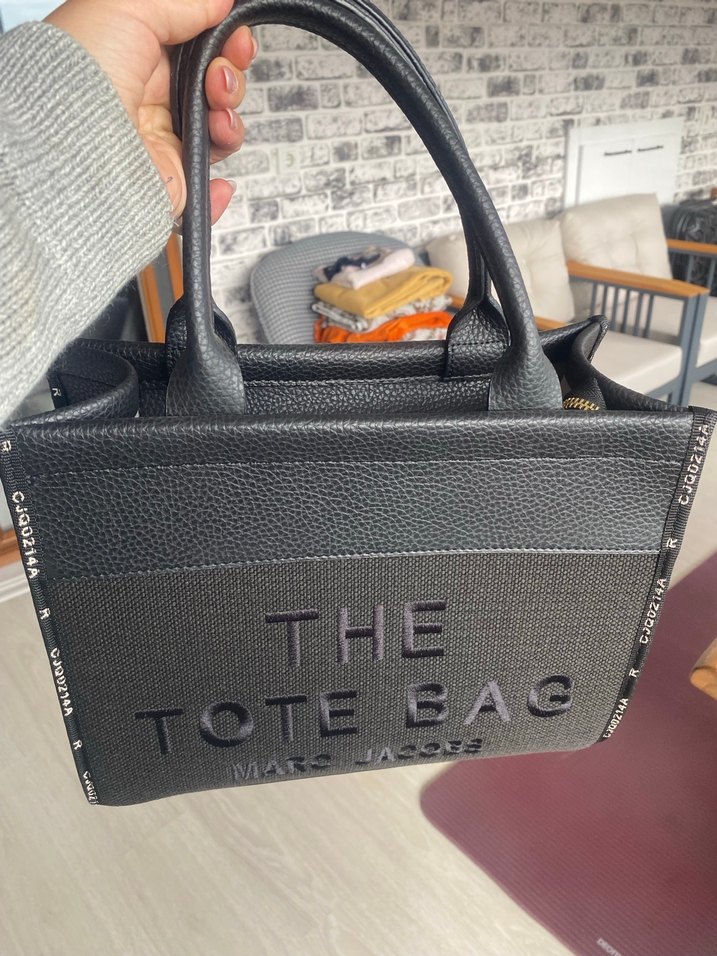 Siyah kadın çantası fermuarlı, "THE TOTE BAG" yazılı baskılı tasarıma sahiptir. Ürün orjinal değildir. Hiç kullanılmadı